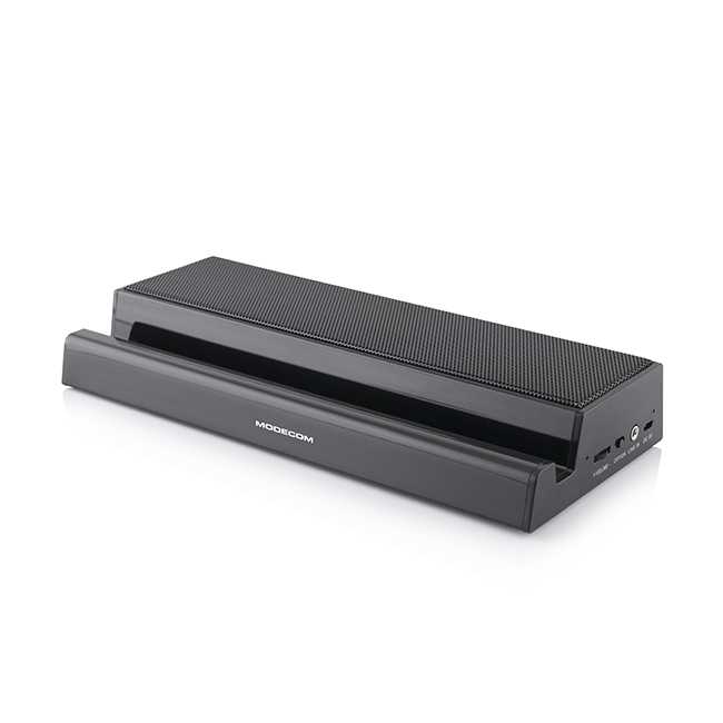 MODECOM MC-BTTS1 to wysokiej jakości zestaw głośników Bluetooth z wbudowaną podstawką pod tablet lub smarfton, przeznaczony do bezprzewodowego odtwarzania dźwięku z urządzeń wyposażonych w moduł Bluetooth®, takich jak tablety, smartfony, odtwarzacze mp3®, czy laptopy. W konstrukcji MODECOM MC-BTTS1 umieszczono dwa wysokiej klasy głośniki emitujące dźwięk charakteryzujący się niesamowitym, czystym brzmieniem z mocnym i klarownym basem. Łatwa w transporcie, prostokątna konstrukcja, pozwala zabrać ze sobą MODECOM MC-BTS1 m.in. na wakacyjne wycieczki, czy weekendowe wypady za miasto