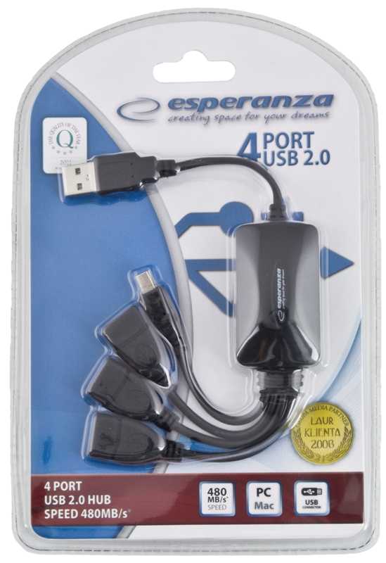 4 portowy, funkcjonalny, szybki USB HUB. Posiada 3 duże złącza USB