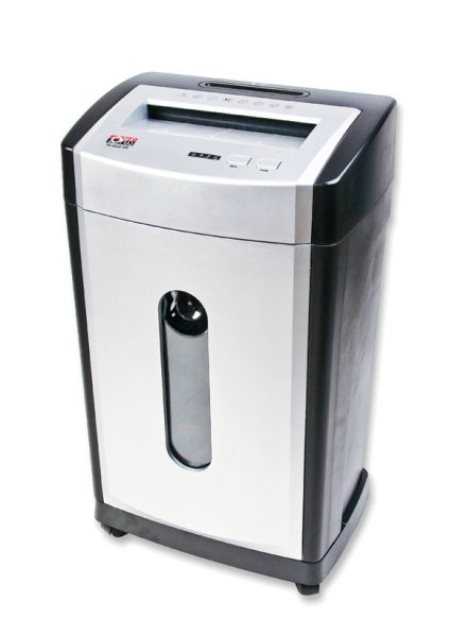 Niszczarka przybiurkowa cross-cut. System paskowo-odcinkowy zapewnia wyższy stopień tajności i kilkakrotnie mniejszą objętość ścinków. Niszczy karty kredytowe i płyty CD.