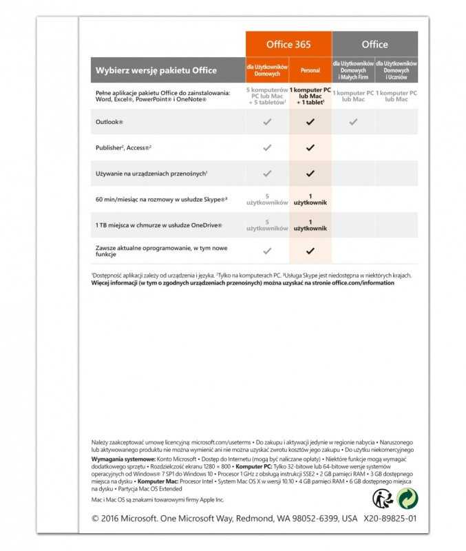 Pozostałe informacje: Do 1 TB miejsca w chmurze w usłudzze OneDrive